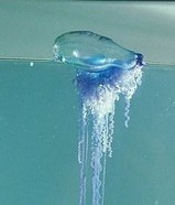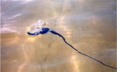 烏帽子のような形をした浮き袋の下に、数メートルにも達する青く長い触手があり、一見、青っぽいビニール袋に似ている。